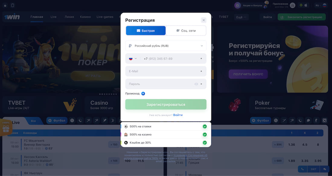 Далее выбирайте свой способ. Вы любите все делать быстро? Тогда регистрация в один клик ваш вариант. Или, возможно, удобнее пройти через email или соцсети? 1 win предлагает вам выбрать то, что подходит именно вам.